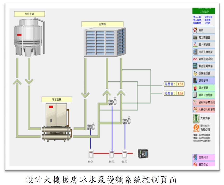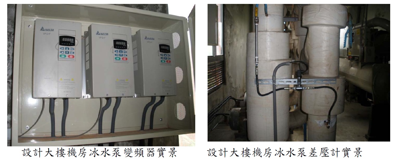 該校將設計大樓中央空調系統冰水泵及區域泵,裝設變頻器依冰水負載調整轉速以節省用電量。