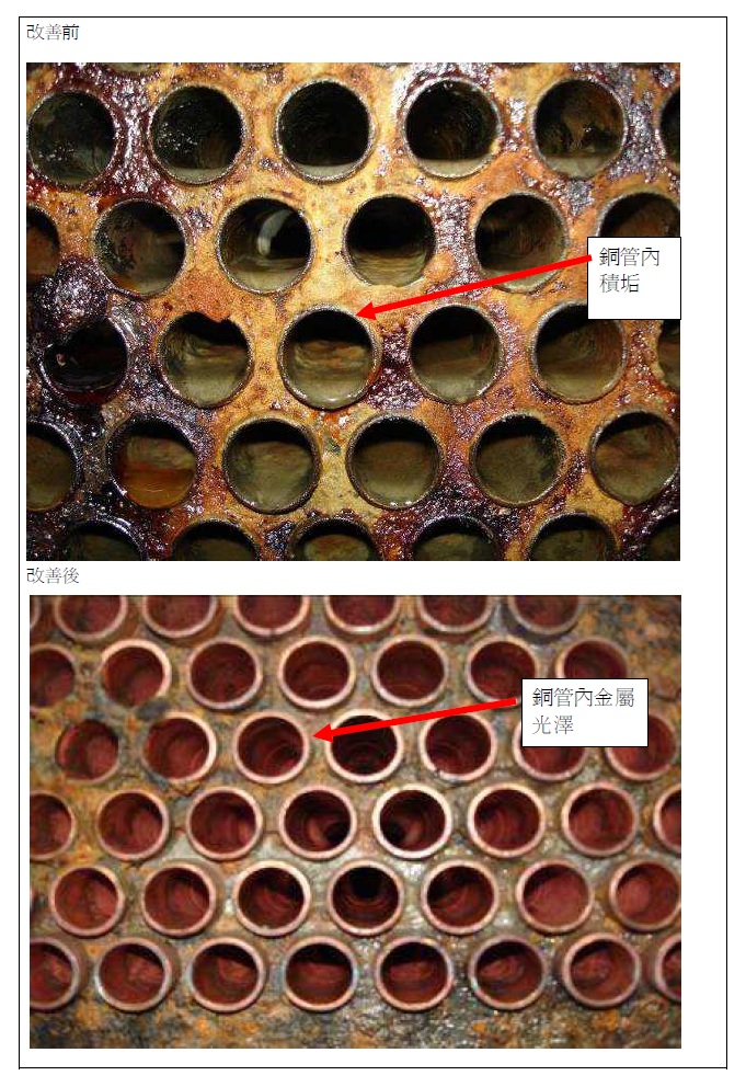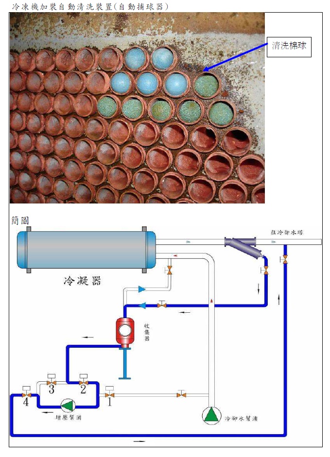 該廠由於冷凍機冷凝器盤管每年清洗一次,無法確保冷凝器熱交換效果隨時保持於最佳狀態,造成冷凍機運轉效率下降,因此於冷凝器(出)入口主管設置自動清洗裝置,確保冷凝器熱交換效果於最佳狀態。