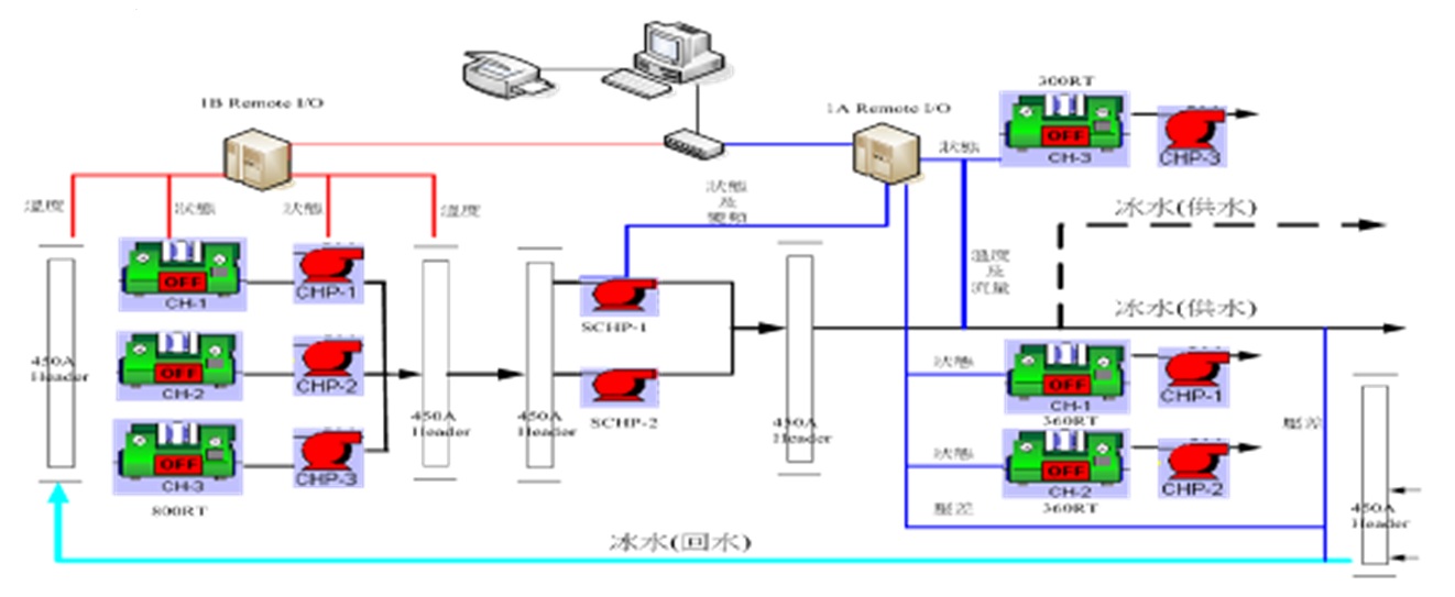 該廠為進行C/D棟冰水機節能,將C/D棟冰水管路整併連結使其由同一套D棟冰機系統供應以達到節能成效。