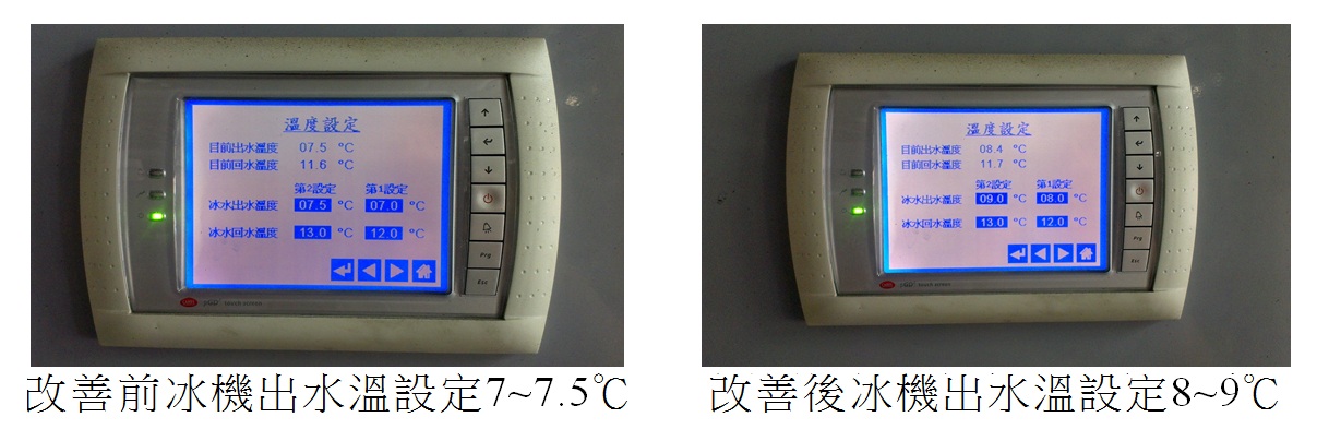 該廠將廠內中央空調冰水主機出水溫度設定往上調升1℃(7→8℃)降低冰水機運轉負荷,以節省能源。