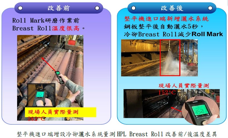 透過冷卻降低breast roll溫度以減少roll mark發生次數,並減少鋼胚於加熱爐空燒的時間。