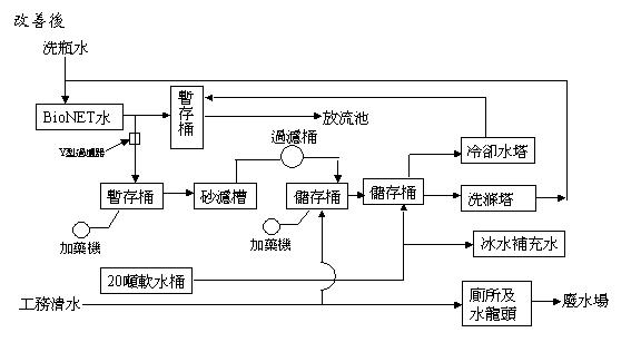 該廠於排放管的底下插管、接閥、接桶,將BioNET處理後要排放的水接入暫存桶,經陸上幫打入石英砂濾槽過濾,出水經PE濾袋過濾再儲存於10噸桶備用;在出水同時加藥機在桶內加氯消味、抑菌,此股水再供應冷卻水塔補水,飛濺及充填機過醋酸洗滌塔洗滌使用。