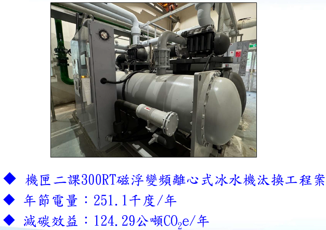 經系統全面檢討後,先換新一組300RT磁浮式冰水機(#22),效能約0.63kW/RT,(周一~周六24小時運轉,新#22主要用於7:00~24:00,大夜班7小時切換至備機)。