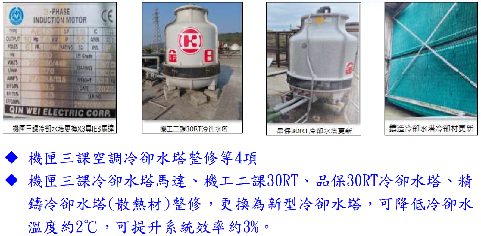 改善前:冷卻系統整修等4處,因冷卻水塔老舊較為耗電。