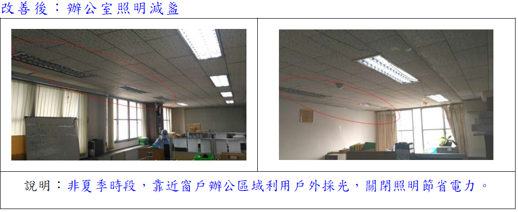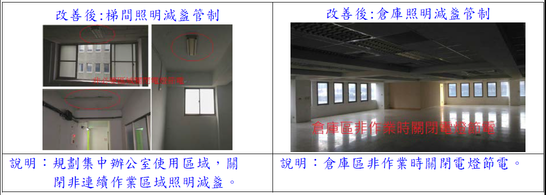 改善後:指派各樓層專人照明管制,少用區域減盞照明。