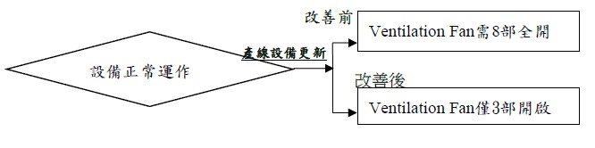 2.改善後: Control Room C/D使用之Ventilation Fan停用5部,僅使用3部仍可維持生產設備正常運作,以節省電力。