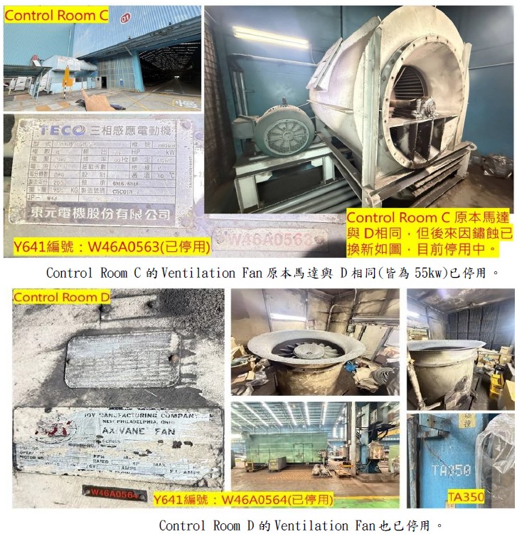 原8部Ventilation Fan藉由產線設備更新故停用5部,減少鋼板工場Control Room C/D的Ventilation Fan使用耗電,以節省電力。