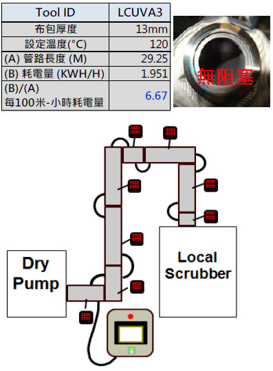 UV Curing Piping加熱帶溫度設定為120度,以防止製程氣體clogged在管路上,但其實此製程氣體僅有He , Ar , O3 , O2,於Piping內不會有clogged的機會,因此在不影響主機台生產的狀況下可將加熱帶關閉進行節能。