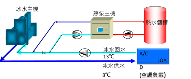 - 與空調系統整合,除供應熱能外更提供部分冷能,分擔部分冰水機負荷(須提供固定空調負載量以供熱泵取熱)。