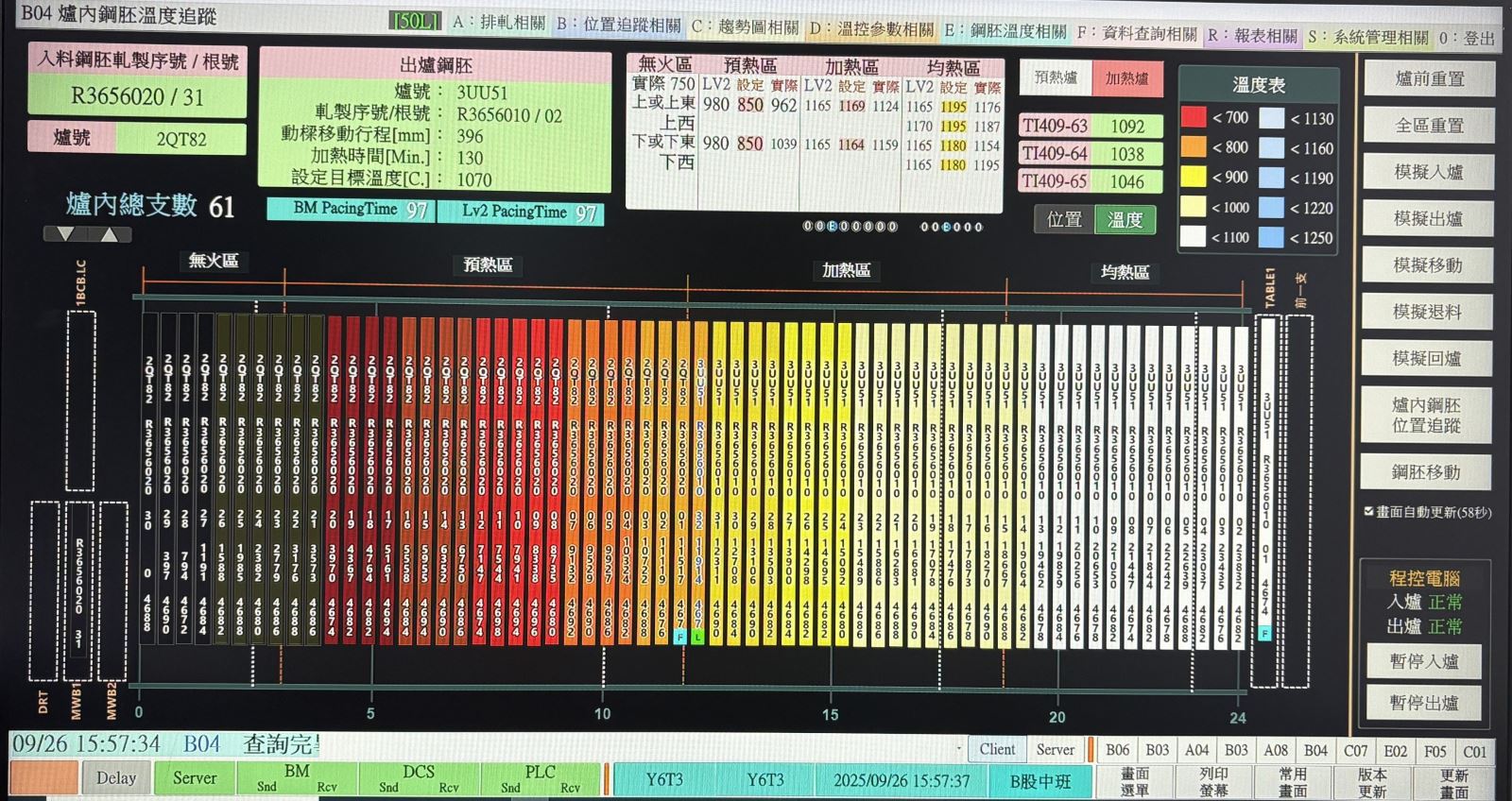 - 爐溫自動控制模組,結合熱傳模型與智能方式,配合出爐速度,自動計算節能控溫模式以降低能耗,鋼胚出爐溫度命中率大幅提升20%以上,降低能耗6%。