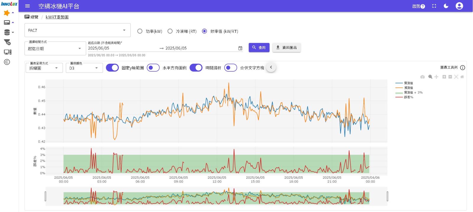 - 設計理念:取冰水主機、冷卻水塔、泵浦等共 33 個特徵因子建模,針對不同設備的特性,選用不同演算法作為預測模型,由外氣焓值及負載量,預測冷卻水塔最佳運轉台數、運轉頻率、出水溫度,冰機最佳運轉組合 & 泵浦運轉頻率等。