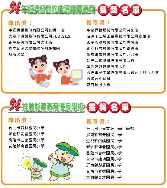 榮獲今年「節約能源績優廠商傑出獎」為:中國鋼鐵(股)公司軋鋼一廠、力晶半導體(股)公司FAB12廠、正隆(股)公司大園廠、國立台灣大學醫學院附設醫院、慈濟大學等5家。獲選「績優廠商優等獎」為:中鴻鋼鐵(股)公司冷軋廠、台灣苯乙烯工業(股)公司高雄廠、瀚宇彩晶(股)公司楊梅廠、南亞科技(股)公司錦興廠、榮成紙業(股)公司斗六廠、新光合成纖維(股)公司、富邦建設(股)公司、台達電子工業(股)公司台北辦公大樓、台灣台中監獄、高苑科技大學等10家。得獎之節約能源事績包括製程改善、需量監控、空調節能、採用高效率照明燈具等,足以堪稱業界之節能楷模,做為典範表率。而本次慈濟大學、高苑技術學院及台灣台中監獄獲獎,更代表學校、政府機關積極推動節能且成效卓越之具體表現。