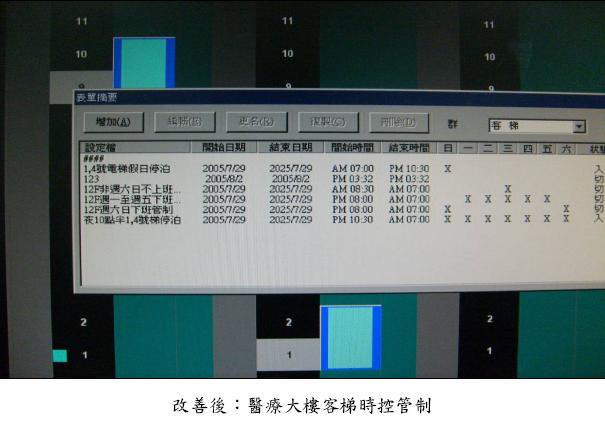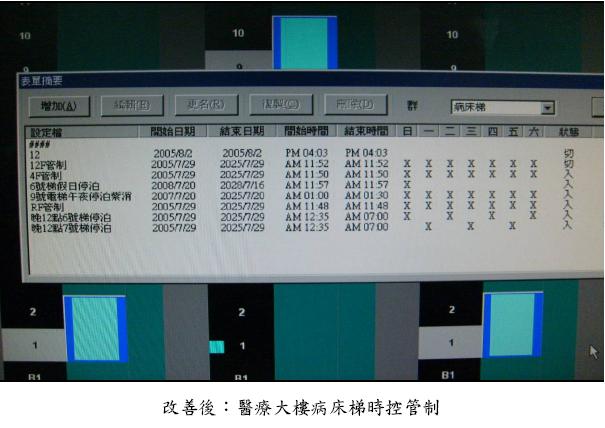 該院於95年起電梯依據醫療服務特性及時間性,調整電梯開放台數、樓層等管控制度。