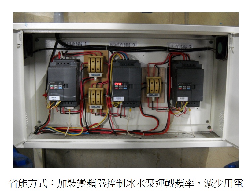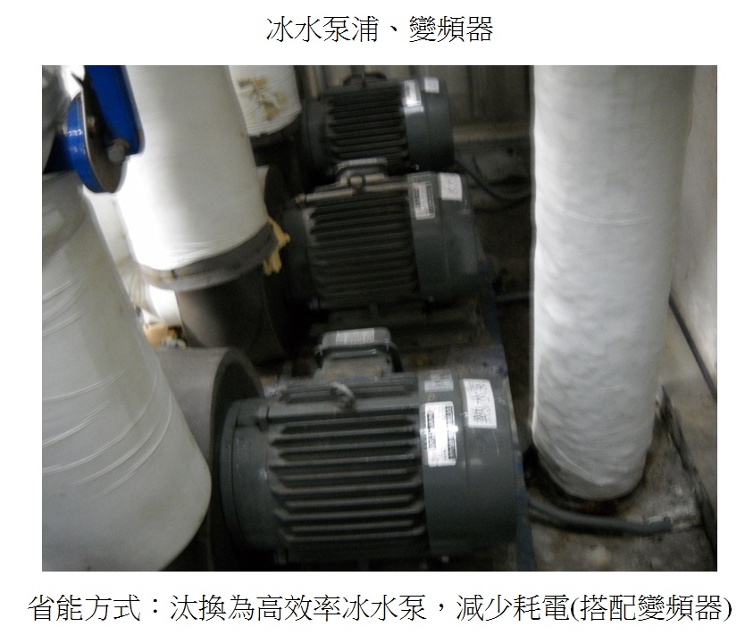 該公司汰換低效率冰水泵浦,換裝高效率水泵浦並加裝變頻器,依主機負載需求,提供足夠水量減少耗電量。