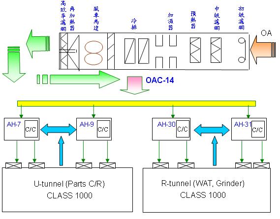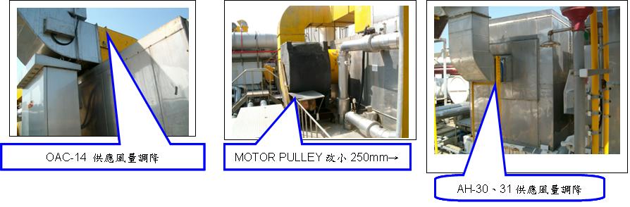 該廠為OAC系統節能進行以下之節能措施: 1.外氣空調箱OAC-14 MOTOR PULLEY改小,OAC-14 供應風量調降。 2.將空調箱AH-7,9改為單台運轉。 3.將空調箱AH-30,31風量調小。