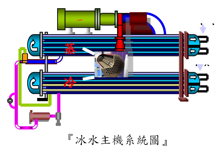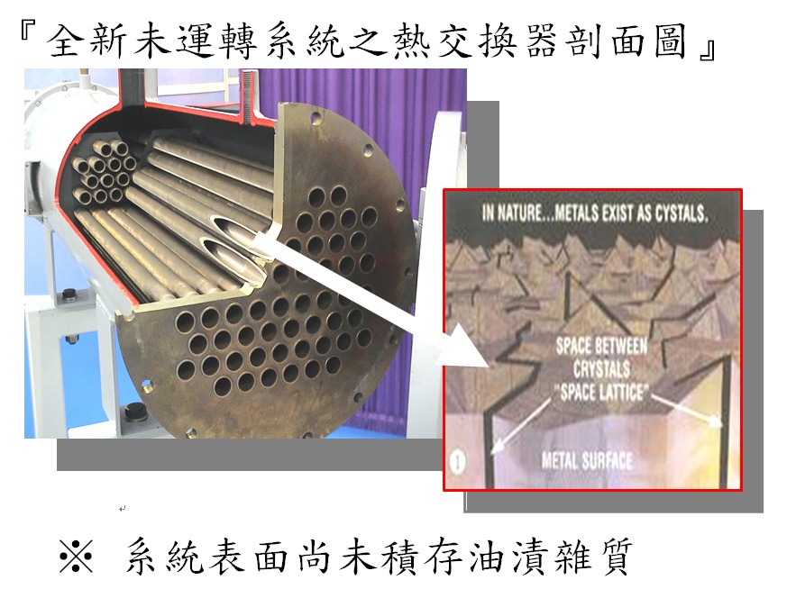 2.於冰水主機熱交換器中添加FRIGAID冷媒側添加劑,使其帶負電荷的分子附著並清除銅管表面之油漬雜質,使熱交換面積增大恢復冰水主機原有性能效率,節省耗電(kW/RT)。