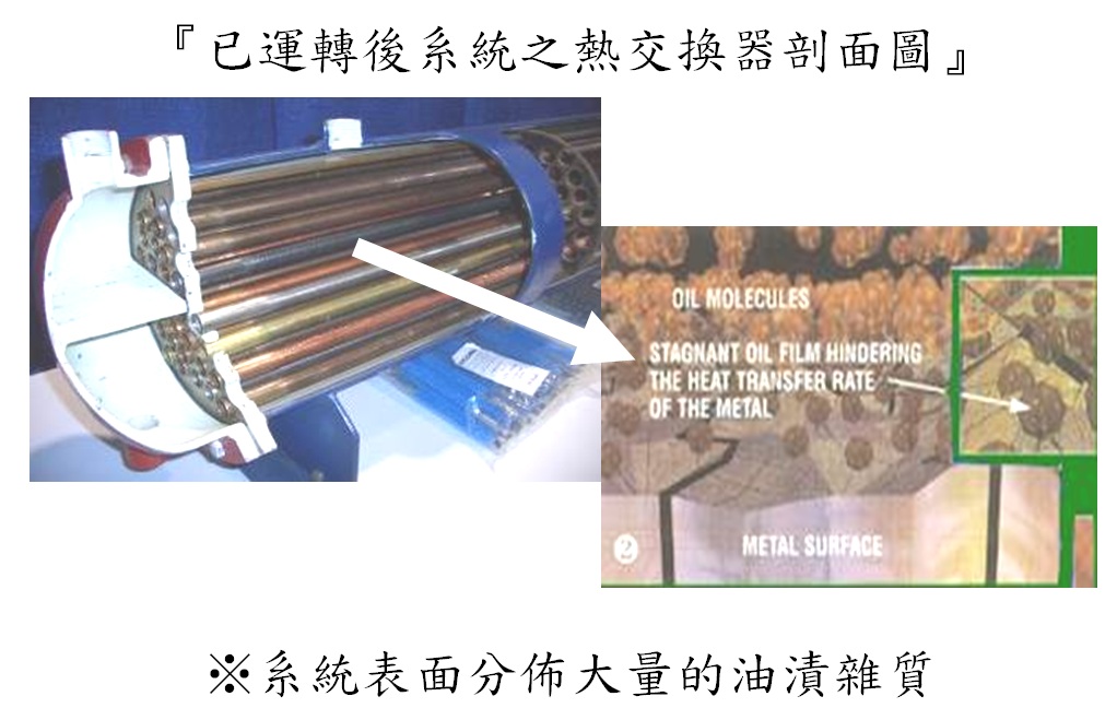 (1)冰水主機全年365天、24小時皆在使用,然而在長時間的運轉下,系統之冷媒側中如冷凝器、蒸發器及管路,內部金屬表面已積滯大量的油膜、積碳、污染物等,這不僅會阻礙熱交換作用、降低空調系統效率。C.O.P(E.E.R)、浪費電力以外,更會縮短設備使用壽命,相對也產生了龐大的空調使用費用。