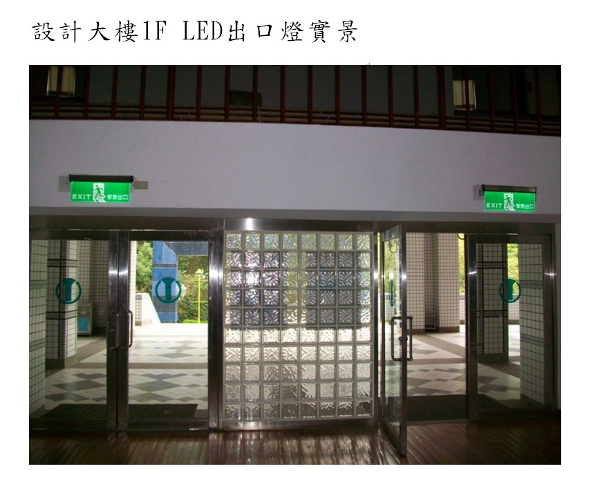 該校將設計大樓之消防出口燈傳統式耗能T8燈具,更換為高效率省電LED燈具,以節省耗電。