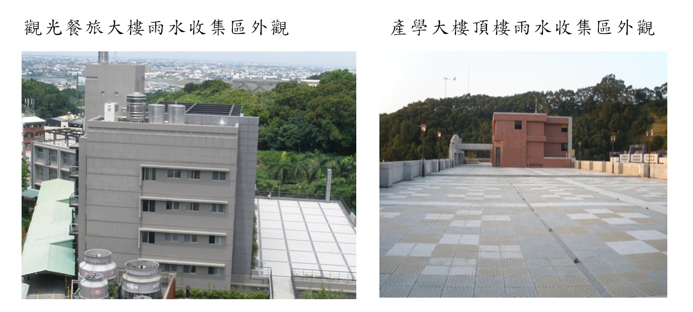 該校實施雨水回收措施,應用於以下之目的: 1.產學大樓收集雨水,供應圖書館前方綠地草皮澆灌及屋頂灑水降溫、空調冷卻水塔用水。 2.產學大樓收集雨水,供應工學大樓沖廁及週圍綠地澆灌。 3.觀光餐旅大樓收集雨水,供應行政、管理大樓沖廁及週圍綠地澆灌。