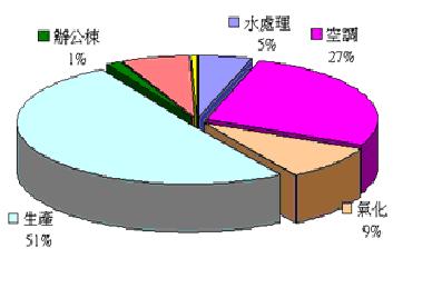 一般晶圓廠用電量較大者為製程機台設備,約佔50%,空調系統大約30%,水處理系統約佔耗量6%,
