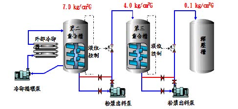 將第二重合槽壓力控制於7.0Kg/cm2G,第三重合槽壓力控制於4.0Kg/cm2G、釋壓槽壓力控制於0.1Kg/cm2G,利用壓差將粉漿輸送至下一槽,減少電力耗用。