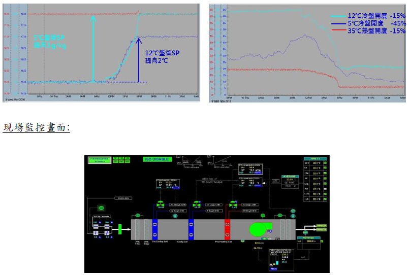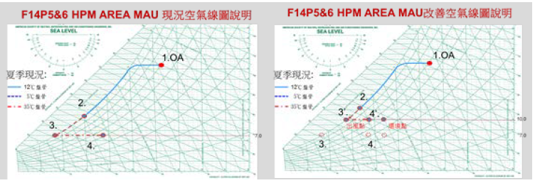 HPM MAU 12℃盤管控制出口溫度設定為15℃,再由5℃盤管控制相對濕度(43%)進行降溫除溼,若以出口溫度(18℃Tdb)不變,將提高工作環境相對溼度(43%->60%),(ASHARE 55建議相對溼度70%~50%) ,並將12C盤管控制出口溫度設定為17℃,以進出溫度條件不變下,可將提升節省成本,並且工作環境更舒適,創造雙贏局面。