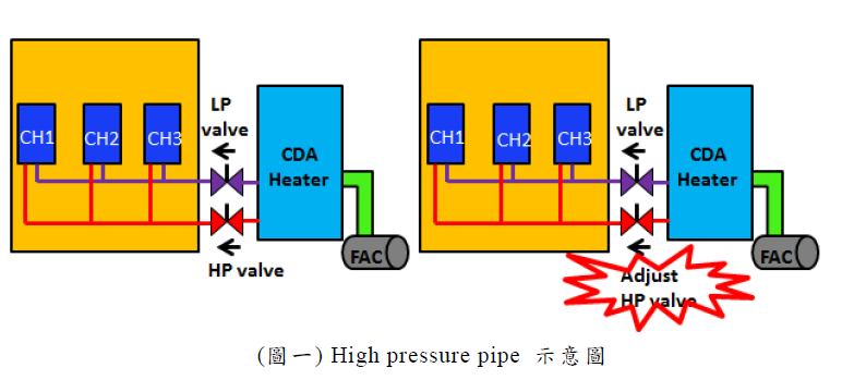 將CDA高壓管路上的調壓閥做調整,達到降低高壓管路的壓力(如圖一),使得在相同的使用時間下,節約14% CDA使用量。