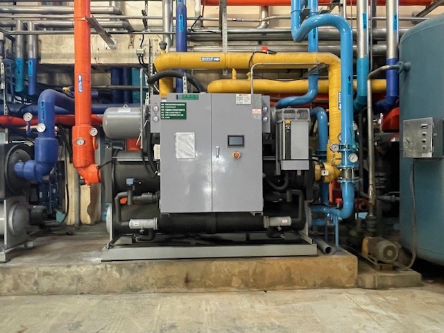 - 提升整體空調系統的效率及強化智慧化管理,將既有兩台使用年限超過15年的 120 RT 螺旋式冰水主機及一台舊式滷水系統,分別汰換為120RT高效率水冷變頻磁懸浮離心式變頻冰水主機及螺旋式冰水主機,提升能源使用效率,專案節能率達45.8%。