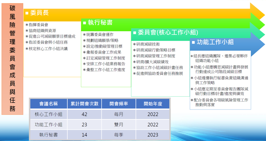 該公司之碳風險管理委員會,由製造中心副總帶領,設置核心功能小組,負責研商減碳行動策略目標;其中環安單位擔任執行秘書角色,負責設定及推動碳管理目標。