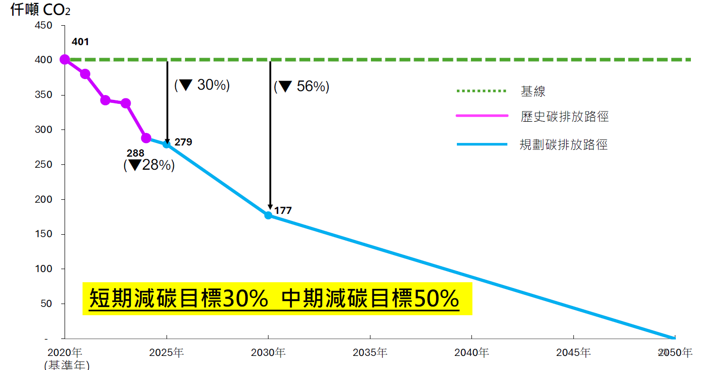 - 規劃碳排放路徑短期減碳目標30%、中期減碳目標50%,由目前已進行之製程改善案估算,2030年減碳實績可達56%。